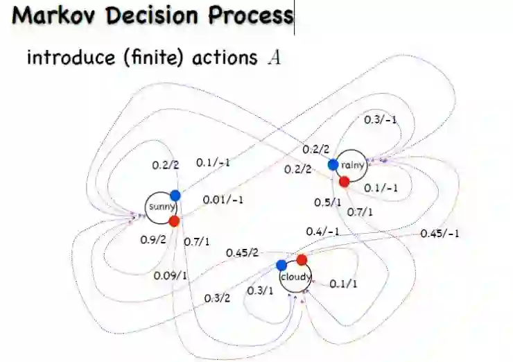 对于马尔科夫过程和马尔科夫决策过程,我们只能观察它运行下去的结果,而不能对它的运行过程加以干涉。加上一个决策以后就可以干涉了,这就是马尔科夫决策过程,不同的动作决定了转移的概率是不一样的,所以现在我们可以在每个状态上选择不同的动作。
