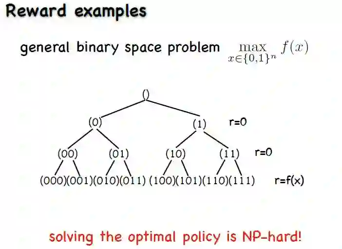 我们还要设定一个奖赏——中间每一层奖赏都是0,只有最后一层的奖赏是F。这就会使得,如果有一个最优的强化学习的策略,能够找到最优的路径到达节点,那么它就能使得这个奖赏最大、F最大。