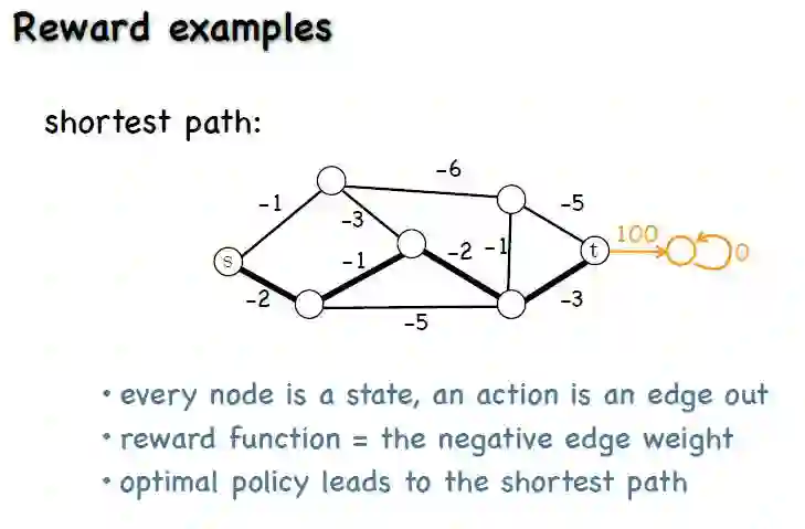 通常强化学习是让奖赏最大化,因此这里把路径上的权重先取一个负的值,让它最大化这个负的值。稍微做一点变化的是,t会指出来一个单独的绕自己循环的节点。