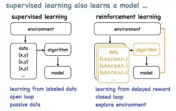 另外,强化学习的算法和监督学习的算法也是不一样的。两者的模型可能是一样的。监督学习里面可以是一个决策树,也可以是一个神经网络,也可以是一个模型,在强化学习里也是一样。