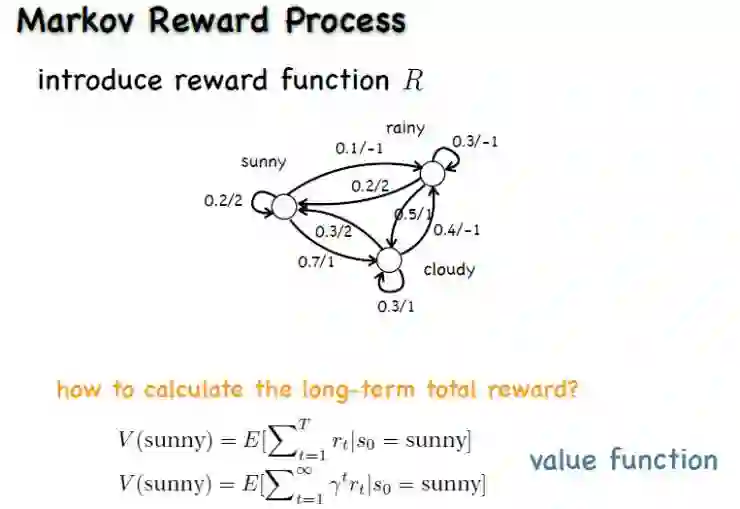 假设天气一直是出太阳的状态,这样运行下去以后,我能拿到的总回报是多少。这个总的回报可以用一个符号V来表示。根据之前我们的描述,我们可以有不同的计算方式,比如说全部加起来或者打个折再相加。