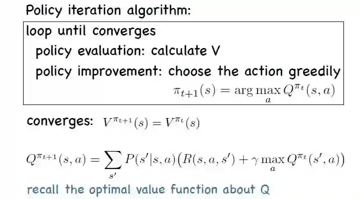 这个算法的意思是,先计算你给出的这个策略的V值,然后用这种等式来更新这个策略,更新完以后又去计算这个V值是多少,又来更新这个策略,这样就可以保证这个策略最后收敛到最优策略。当然前提是你使用的是这个表格状态表示,有穷多个的状态和有穷多个的动作,这个方式对应的等式就是刚才的第一个等式。这个算法可能效率比较低,因为它需要不断的评估更新后的策略。这一方法称为策略迭代。