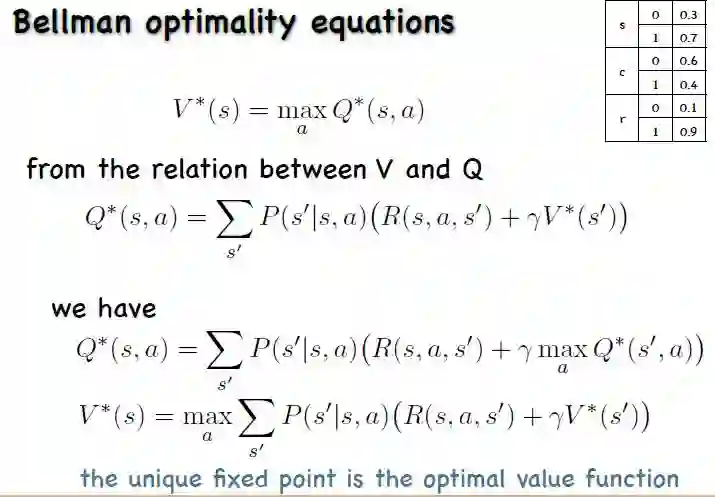 最优策略对应的V值就是最优V值,对应的Q值就是最优Q值,怎么样求取最优的策略呢?由于这个V和Q之间是有一定关系的,所以我这里先直接给出两个等式,一个是通过Q值来算Q值的,一个是通过V值来算V值的。只要把最优Q和V的关系带到一般Q和V的关系中就直接可得。