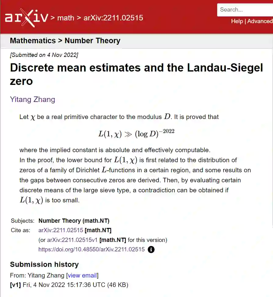 11 月 5 日,有消息称张益唐攻克朗道 - 西格尔零点猜想的论文已完成。11 月 7 日,该文论在 arXiv 上正式对外公开。网站信息显示,该论文提交时间为 2022 年 11 月 4 日。据悉,该论文的标题是《离散均值估计和朗道 - 西格尔零点》(Discrete mean estimates and the Landau-Siegel Zero),共 111 页,由 18 个部分组成。