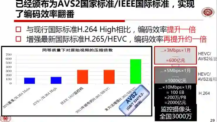 AVS2中有一项我们的独有技术,叫“场景编码技术”,使用了这个技术的编码系统,编码效率比现在第三代又高了接近一倍。所以我们经常开玩笑说,场景编码技术让我们提前跨入新一代编码标准时代。这是我们领先于国外标准的地方。