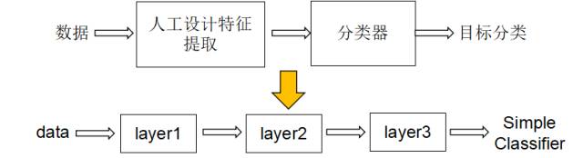 机器识别的传统方法依赖人工预先设计的特征对原始数据进行分类和处理: