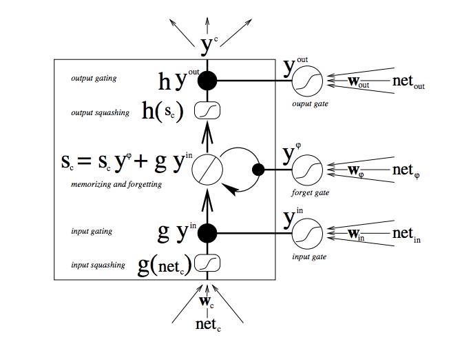 图中的黑点即是门,分别决定何时允许新输入进入,何时清除当前的单元状态,以及/或何时让单元状态对当前时间步的网络输出产生影响。S_c 是记忆单元的当前状态,而 g_y_in 是当前的输入。记住,每个门都可开可关,而且门在每个时间步都会重新组合开关状态。记忆单元在每个时间步都可以决定是否遗忘其状态,是否允许写入,是否允许读取,相应的信息流如图所示。