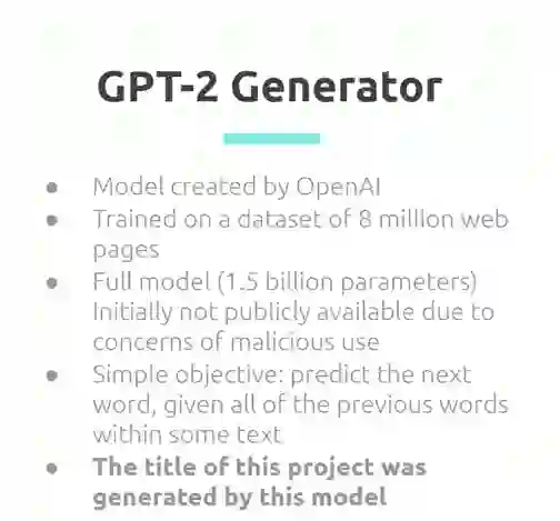 该项目说明了自然语言生成模型在过去三到四年中的进展:从LSTM的不连贯性到现在由OpenAI开发的听起来流利的GPT-2模型。 生成文本模型没有“真实”或“伪造”的感觉,因此听起来逼真的生成模型几乎肯定会导致令人信服的“假新闻”。展望未来,人工智能研究人员,学者和行业领导者将面临越来越不可能的任务,即寻找方法来识别机器生成的文本。