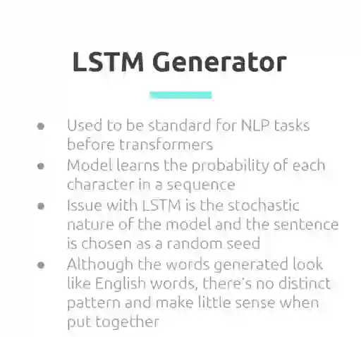 该团队探索了使用LSTM(长期短期记忆)架构和变形器架构的文本生成模型。在2017年推出变形器之前,LSTM被认为是NLP任务的标准。被允许进行比较,并检查该领域取得的进展。
