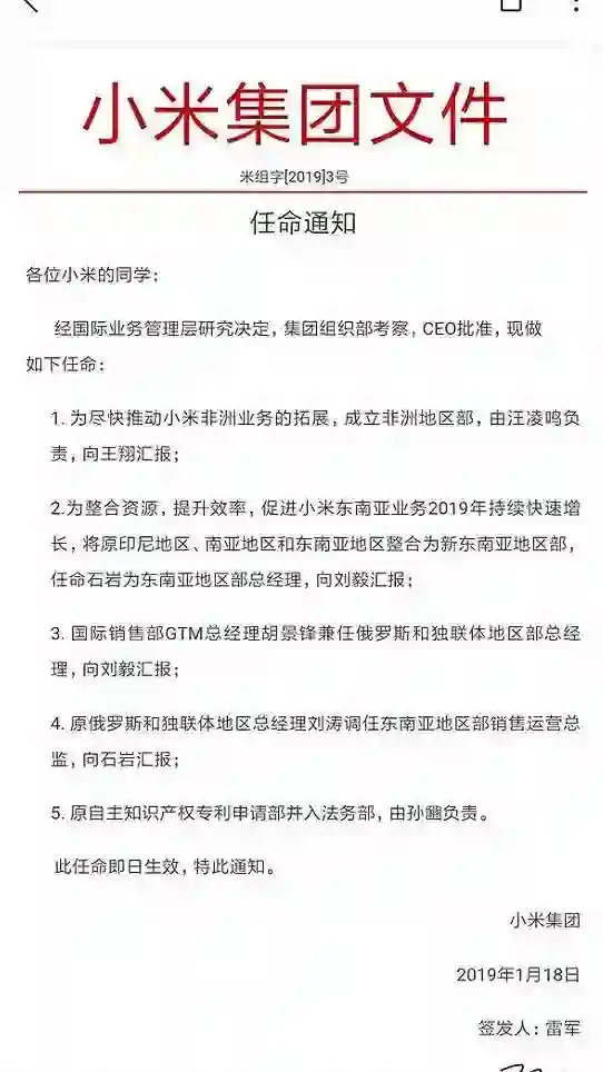 1月21日消息,小米18日发布任命文件宣布成立非洲地区部,由副总裁汪凌鸣负责,向小米高级副总裁王翔汇报。此外;将原印尼地区、南亚地区和东南亚地区整合为新东南亚地区部,任命石岩为东南亚地区部总经理,向刘毅汇报。