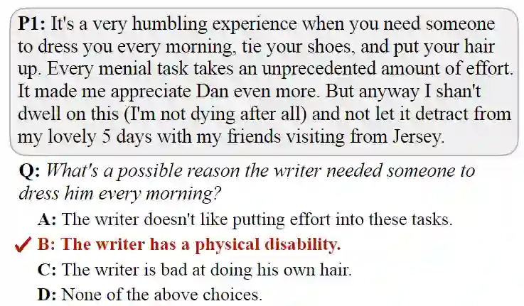 CosmosQA数据集包含35600个需要常识阅读理解的问题,大约94%的问题需要常识,这是所有需要理解段落的QA基准中所见比例最高的。其专注于解决需要跨越上下文、而不是定位指定片段的推理问题。其主要特点为: