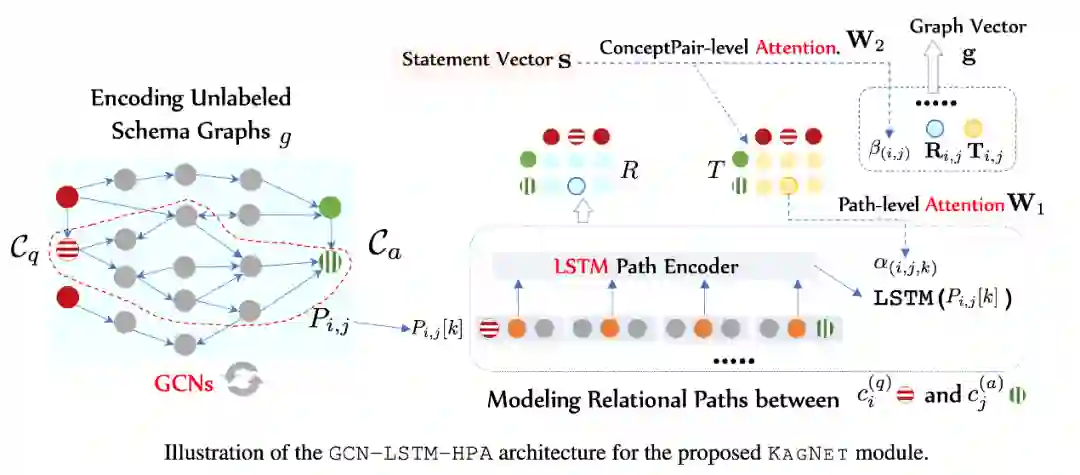 KagNet对RN进行了改进,可以看作知识增强的关系网络模块,使用LSTM编码从问题中的实体到答案中的实体的所有K跳的路径: