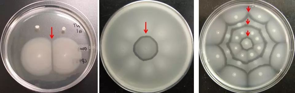研究的想法开始于王晓雪等准备运动平板,科研人员发现当把不同大肠杆菌 K-12 BW25113菌株接种在同一运动平板上时,经过一段时间,菌株在相遇的区域建立起一道“防御线”,形成了一道类似于“国界”的分界线(图1,红色箭头)。