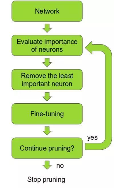 这个想法是,在网络中的许多参数中,有些是多余的,对输出没有太大贡献。如果您可以根据对网络的贡献排列网络中的神经元,则可以从网络中移除低排名的神经元,从而形成更小,更快的网络。可以根据神经元权重的L1 / L2均值,平均激活,一些验证集上神经元不为零的次数以及其他创造性方法来进行排序。获得更快/更小的网络对于在移动设备上运行深度学习网络非常重要。