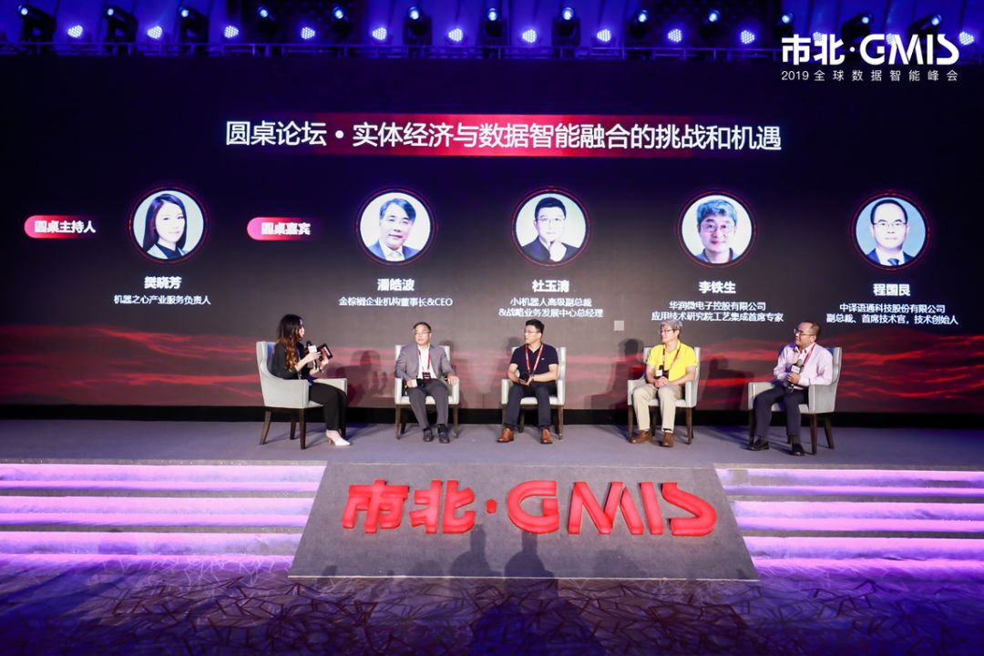 在最后的圆桌论坛上,金棕榈企业机构董事长、CEO 潘皓波,小 i 机器人高级副总裁杜玉清,华润微电子控股有限公司应用技术研究院工艺集成首席专家李铁生和中译语通科技副总裁、首席技术官程国艮一通探讨了实体经济与数据智能融合的挑战和机遇。
