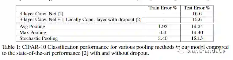 下表是随机池化在CIFAR-10上的表现,可以看出,使用随机池化效果和采用dropout的结果接近,证明了其有一定防止过拟合的作用。