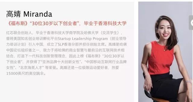 从履历上看,这位80后创始人确实年轻有为,红芯联合创始人高婧则涉及学历造假。曾经,高婧一度的介绍是,毕业于香港科技大学商学院及哈佛大学。但真实情况是,高婧并非是毕业于哈佛大学,而是哈佛大学的(交流学生)。