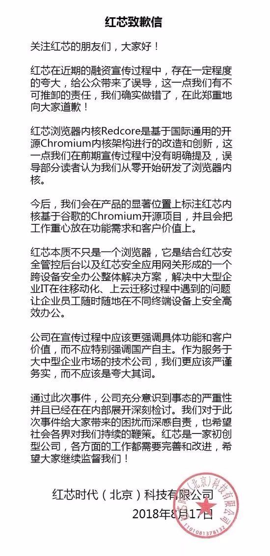 昨日,红芯方面也回应了质疑,据中国网报道,红芯联合创始人高婧回应,红芯浏览器“包含‘Chrome’在里面”,但并非抄袭,而是“站在巨人的肩膀上去做创新”,如智能感知渲染引擎及应用安全方面都有创新,这些功能需连接云服务,“单看安装包是看不到任何东西的”。她还称,客户满意度很高,“绝不是那些人说的拿国产概念去骗钱”。