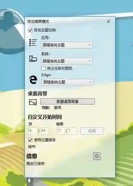 Windows 10 目前虽然提供了暗色模式,但无法实现根据时间自动切换。如果你希望实现这个功能,可以尝试下载使用「自动暗黑模式 (Windows-Auto-Night-Mode)」这款小工具。它不仅支持对系统和应用进行独立的深/浅模式设定,还为 Edge 浏览器提供了配套选项,同时支持根据不同的主题模式切换不同的桌面背景。另外,如果你不希望安装软件,也可以使用 Windows 的计划任务来实现自动切换暗色模式的功能。具体方法请参考:让 Windows 10 也能自动切换深/浅色主题