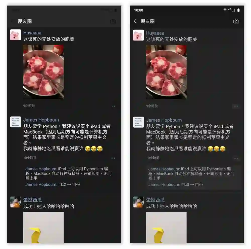 睡前看手机已然成为了不少人的日常习惯。在昏暗的灯光下注视屏幕,长时间容易引起视疲劳。为了缓解这个问题,厂商纷纷在近几年引入自动调节屏幕亮度的功能,不少厂商还加入了「夜间模式」,通过减少蓝光的方式来提升夜间使用体验。「暗色/深色模式」的出现,可以进一步降低屏幕的亮度,缩小屏幕显示内容与环境光强度的差距,让你在夜间看屏幕时不那么刺眼。采用暗色的界面设计并不是什么新鲜事,许多专业级的生产力工具,比如 Adobe 旗下的产品、还有苹果的 Final Cut Pro X 和 Logic Pro X,采用的都是暗色的界面,这种设计能够提供出色的沉浸感,突出显示的内容。虽然暗色和专业本身没有直接的关系,但随着暗色设计在专业产品中的普及,许多用户也接受了这种审美上的偏好。Logic Pro X更重要的是,暗色还与 OLED 屏幕本身黑色不发光的特性相契合。目前大多旗舰机的手机屏幕都选择使用 OLED 材质的屏幕,这给暗色模式的普及提供了助力。不仅如此,在 OLED 屏幕上使用暗色主题还能起到节电的效果。根据谷歌的研究,暗色主题能够使 OLED 设备在同等亮度下的电量消耗减少 63%。亮度小、沉浸感好还能节电,暗色模式成为厂商和用户的「新宠儿」也就成了顺理成章的事。Google 自家应用在正常/暗色模式下的耗电对比暗色不只是纯黑既然用户想要暗色模式,厂商也没有理由拒绝,那么为什么不做呢?其实,做一个体验出色的暗色模式并不容易,远远不只是「换个黑色界面」这么简单。以背景颜色为例。如果你仔细观察 iOS 和 Android 系统的暗色模式,你会发现它们都没有使用纯黑色(#000000)。虽然研究表明理想状态下在 OLED 设备上使用纯黑主题是最省电的,但实际设计中还要考虑其他因素。iOS 的暗色模式例如,出于无障碍设计的考虑,谷歌推荐采用深灰(比如 #121212)而不是纯黑作为暗色主题的主色调。和纯粹的黑底白字相比,灰底能够在保证足够文本可读性的前提下营造出更为舒适的对比度体验,真正做到减轻用户视觉疲劳的效果。谷歌推荐的暗色背景颜色此外,Material Design 的设计风格也是谷歌不采用纯黑作为暗色模式背景色的原因。具体的分析,可以阅读一下少数派此前的这篇文章:《为什么「暗色模式」不应采用纯黑背景?这是谷歌的理由》关注少数派,在后台回复「暗色模式」即可获得链接。iOS 的深色模式也有不少讲究。苹果在去年的 WWDC 上专门做了一个专题来介绍如何升级适配深色模式:苹果引入了语义色彩(Semantic Color)来帮助开发者快速规划和复用配色方案;将背景色分为基底色(Base)与提亮色(Elevated)来区分视觉;为毛玻璃效果设计了深浅两套配色方案;引入字体化图标来解决深色模式下的显示效果……这些都体现了设计一个暗色模式的复杂之处。深浅颜色不同的毛玻璃效果系统的暗色模式设计不好做,App 的暗色适配同样如此。微信的暗色模式其实去年年底就在 Android 上进行了一次灰度测试,尽管当时大部分界面已经完成了适配,但公众号文章和小程序这些常用功能的界面依旧还是会「照亮你的眼」。作为一个国民级应用,微信的暗色模式适配需要大量的调试工作,这次官方声明或许意味着我们离 Android 和 iOS 上的微信暗色主题真的不远了。 左:使用 Android 10 强制暗色模式/ 右:微信内测版暗色模式