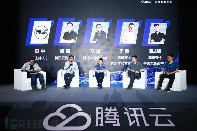 终于到了大家喜闻乐见的侃大山时间,主持人是浅黑科技创始人史中,嘉宾分别是腾讯云副总裁黎巍、腾讯安全副总裁方斌、腾讯安全玄武实验室负责人于旸(TK)和腾讯安全云鼎实验室负责人董志强(Killer)。