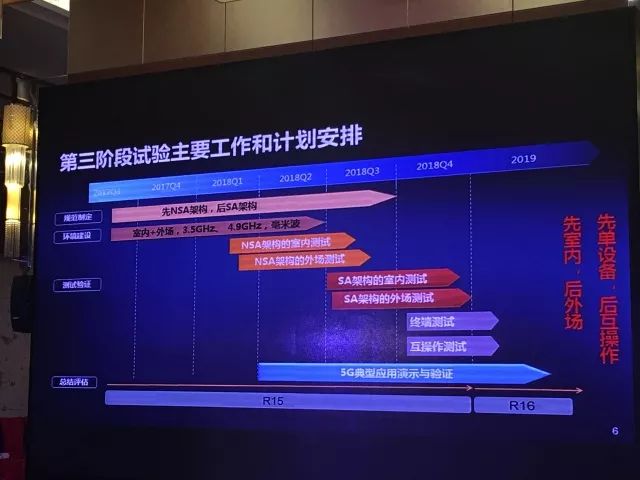 第三阶段试验计划安排是,2018 年完成 5G NSA 和 5G SA 架构规范制定以及 5G NSA 架构的室内测试和外场测试;2018 年第二季度完成 3.5GHz、4.9GHz 室内和外场环境建设;2018 年第三季度至 2018 年第四季度完成 5G SA 架构的室内和外场测试;2018 年年末启动 5G 终端和互操作测试。