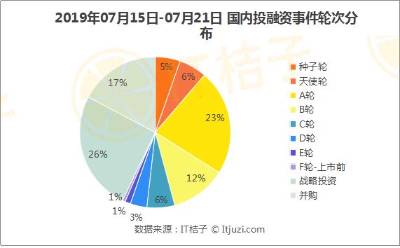 从轮次分布来看,本周战略投资事件占比较大,分别发生 43 起,占比 26%;其次,A轮投资排列第二,发生 38 起,占比 23%;并购事件排列第三,发生 29起,占比 17%。