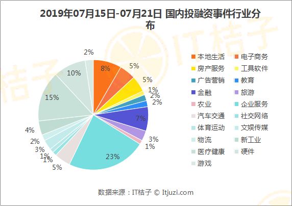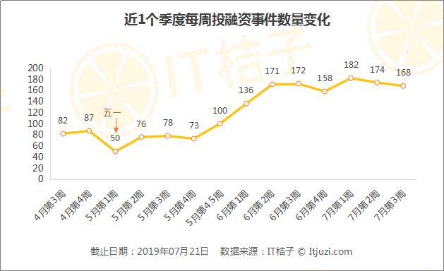 7月第3周,投资市场的活跃度仍然保持着较高的活跃度。上周发生了 168 起投融资并购事件,投资节奏较上上周有所下降,但波动不大。