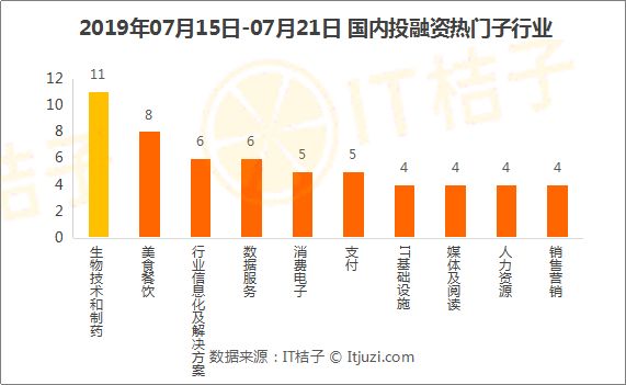 上周最受投资人追捧的子行业依次是生物技术和制药、美食餐饮、行业信息化及解决方案、数据服务、消费电子、支付、IT基础设施、媒体及阅读、人力资源、销售营销。