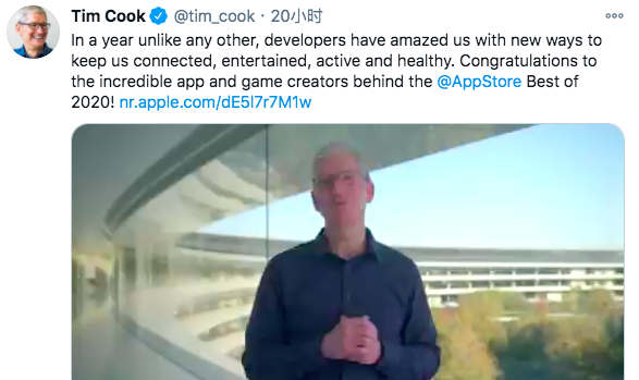 库克也发推说,「在这个特殊的2020里,一些开发者用独特的方式让我们紧密相连,鼓舞我们。祝贺!」