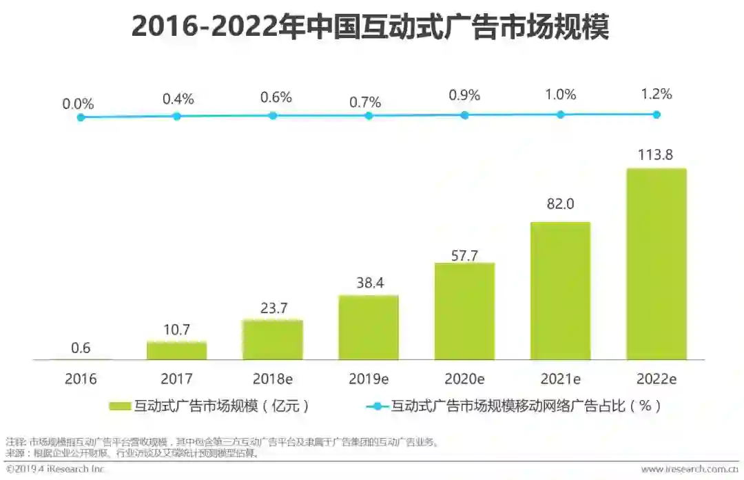 互动广告作为移动网络广告的一种创新形式,自2016年以来,发展尤为迅猛。2017年其市场规模达到10.7亿元人民币。预计到 2022年, 中国互动广告市场将达到113.8亿元人民币, 占移动广告市场总量的 1.2%。