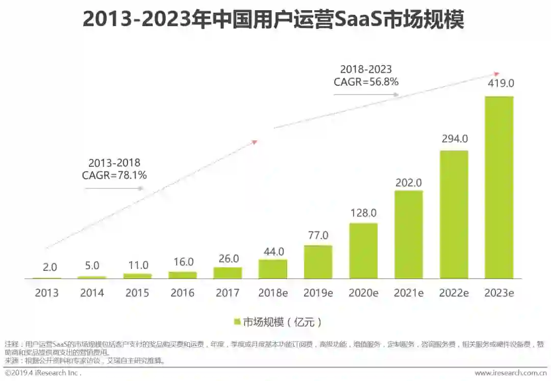 用户运营SaaS旨在帮助企业提升获客能力、提高用户活跃度以及用户留存率,促进企业与客户保持联系,简化流程并改善业务关系。用户运营SaaS的核心任务是围绕企业生命周期建立包括获客、用户活跃以及用户留存在内可持续可循环的关系,并且基于用户运营过程收集大数据并提升数据分析能力。用户运营SaaS为企业和APP开发商提供以消费者为中心的用户运营服务体系,达成用户增长、高频活跃、高效转化等运营目标。2013年,用户运营SaaS市场规模仅为2亿元人民币,2018年增长至44亿元人民币,复合增长率高达78.1%。2023年中国用户运营SaaS市场规模预计会扩大到419亿元人民币,复合增长率为56.8%。