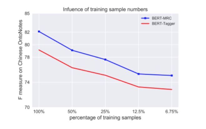最后来看看不同数据集大小对MRC和Tagger效果的影响,下图可见,即使训练数据只有50%,MRC方法都能达到Tagger的最优结果。这也说明了MRC具有一定的先验知识编码能力。