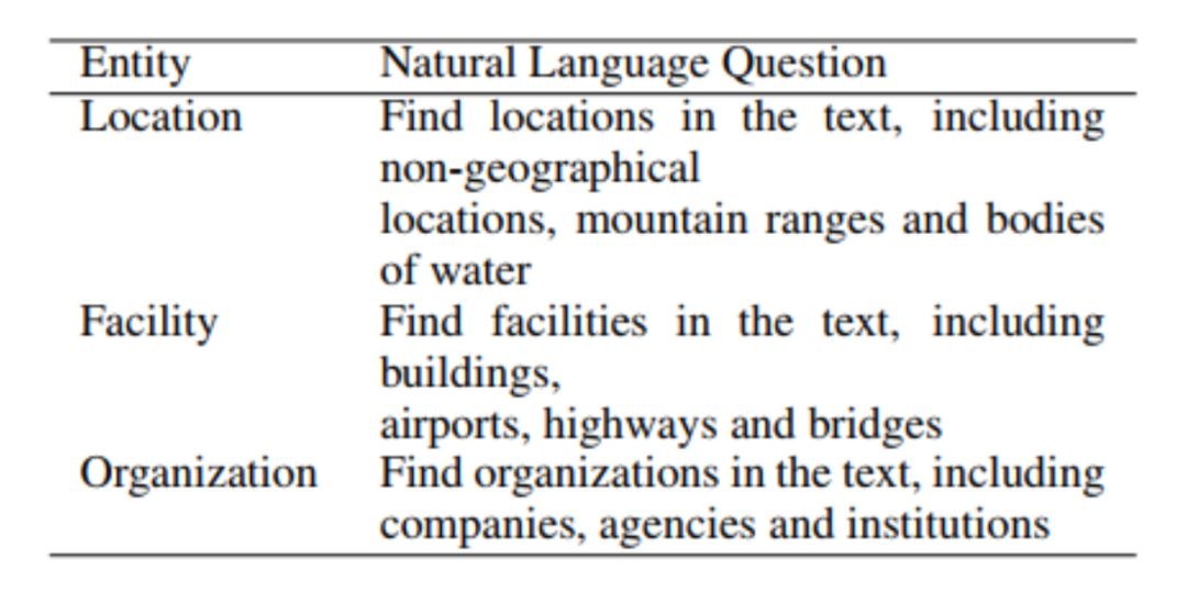 规则模板:用一个模板生成问题,比如ORG的问题是“which organization is mentioned in the text”;