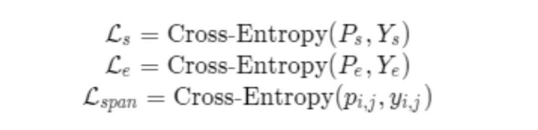 在训练的时候,我们有三个损失,分别是开始位置损失、结束位置损失和实体损失,分别定义如下: