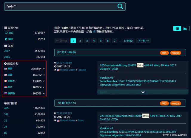 在fofa.so上搜索”exim”发现使用exim服务的服务器数量挺多的,但大部分的exim服务集中在美国。