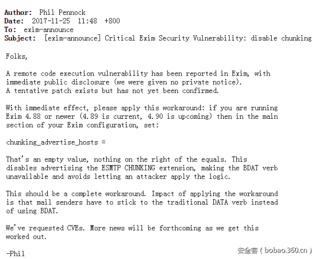 根据漏洞提交者在BugTracker中的说明,需要在Exim的配置文件中,加上
