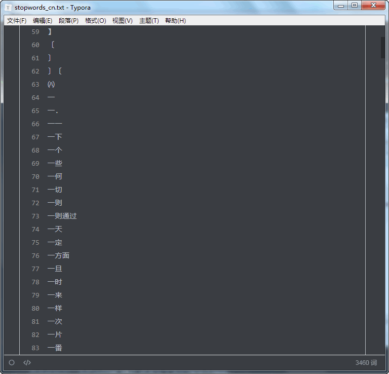 网上有很多中文 stopwords 词库资料,这里选取了一套包含近 2000 个词汇和标点符号的词库:stopwords_cn.txt,结构形式如下: