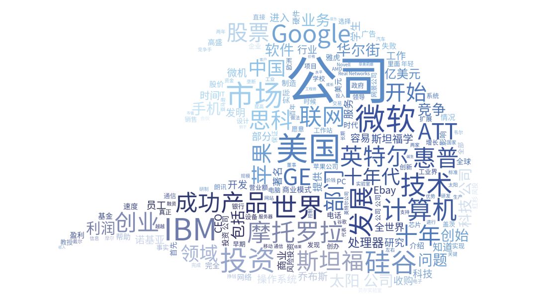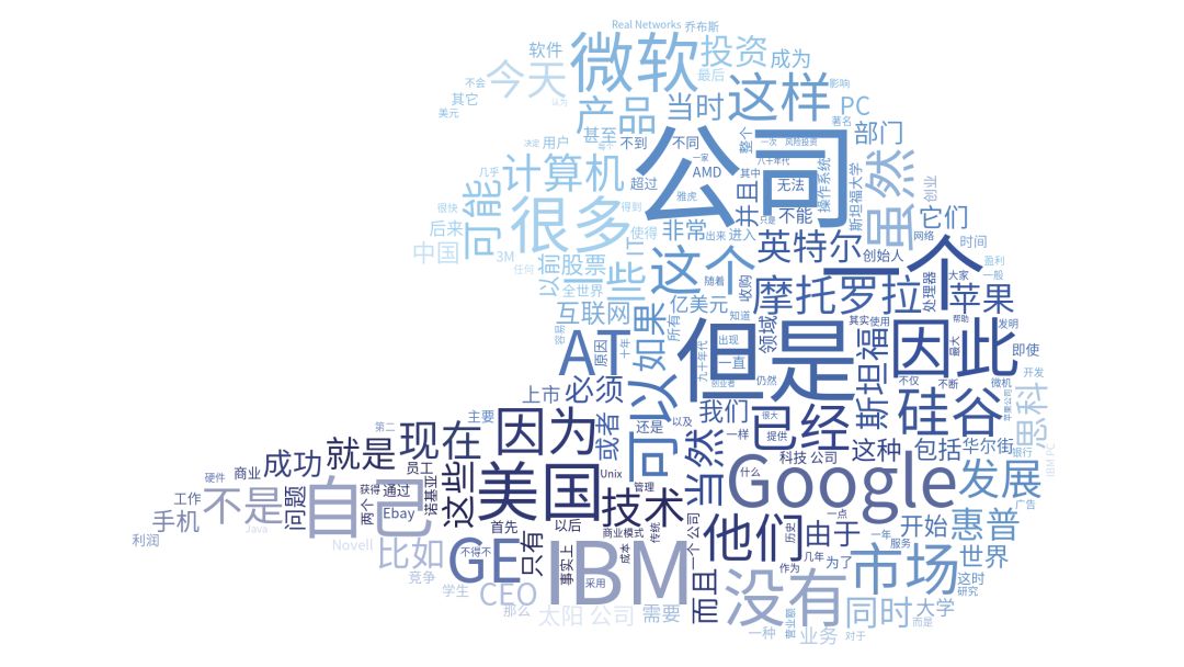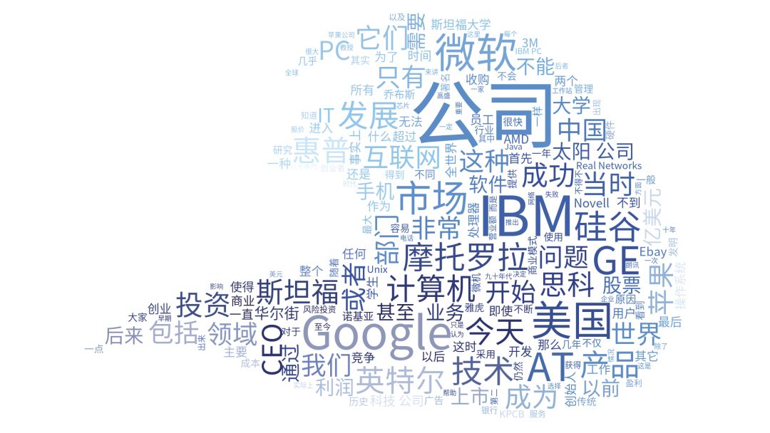 1[('公司', 1462), ('美国', 366), ('IBM', 322), ('微软', 320), ('市场', 287), ('投资', 263), ('世界', 236), ('硅谷', 235), ('技术', 234), ('发展', 225), ('计算机', 218), ('摩托罗拉', 203)...]