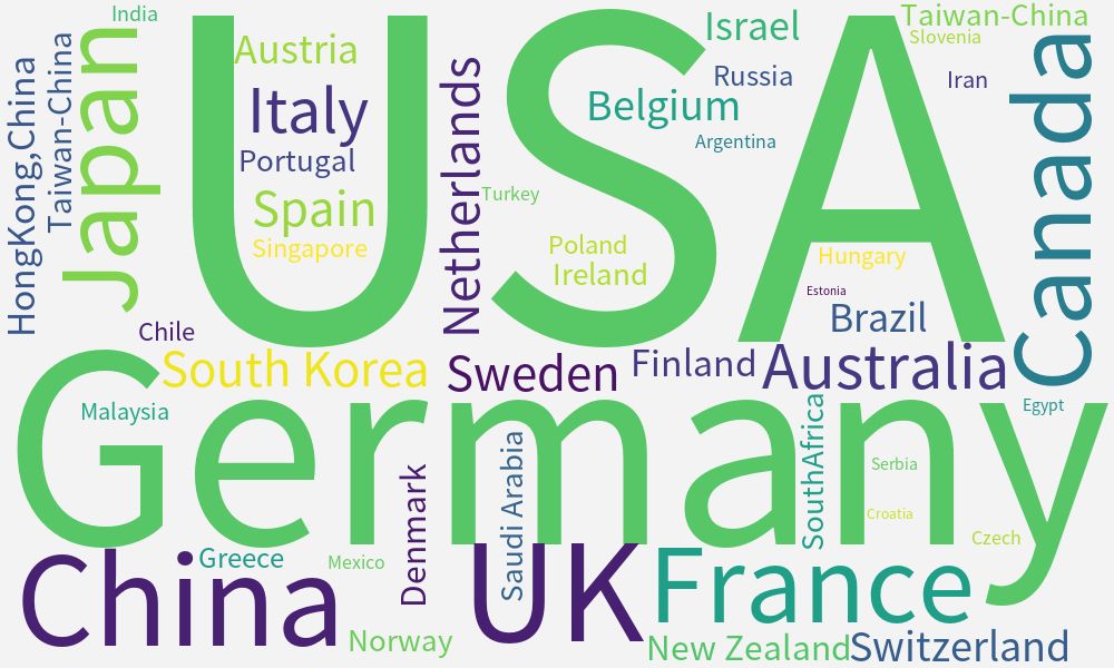 4{'USA': 1459, 'Germany': 382, 'UK': 379, 'China': 320, 'France': 210,..}