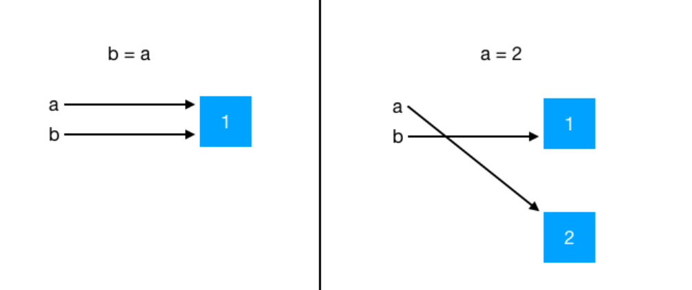a与b在内存中都是指向1的引用,所以a、b的引用是相同的。