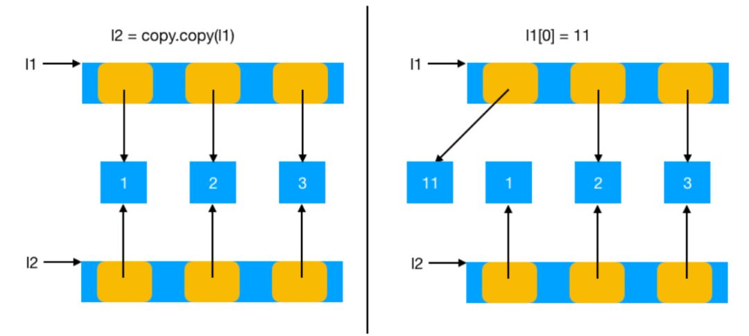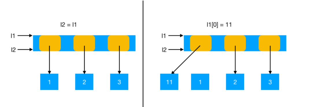 仍然通过一个实例来体会一下,可变对象引用赋值的过程:当改变l1时,整个列表的引用会指新的对象,但是l1与l2都是指向保存的同一个列表的引用,所以引用地址不会变。