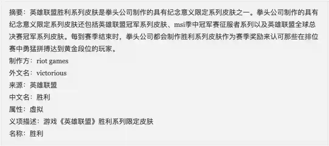 {"alias": ["胜利"], "subject_id": "10001", "subject": "胜利", "type": ["Thing"], "data": [{"predicate": "摘要", "object": "英雄联盟胜利系列皮肤是拳头公司制作的具有纪念意义限定系列皮肤之一。拳头公司制作的具有纪念意义限定系列皮肤还包括英雄联盟冠军系列皮肤、MSI季中冠军赛征服者系列以及英雄联盟全球总决赛冠军系列皮肤。每到赛季结束时,拳头公司都会制作胜利系列皮肤作为赛季奖励来认可那些在排位赛中勇猛拼搏达到黄金段位的玩家。"}, {"predicate": "制作方", "object": "Riot Games"}, {"predicate": "外文名", "object": "Victorious"}, {"predicate": "来源", "object": "英雄联盟"}, {"predicate": "中文名", "object": "胜利"}, {"predicate": "属性", "object": "虚拟"}, {"predicate": "义项描述", "object": "游戏《英雄联盟》胜利系列限定皮肤"}]}