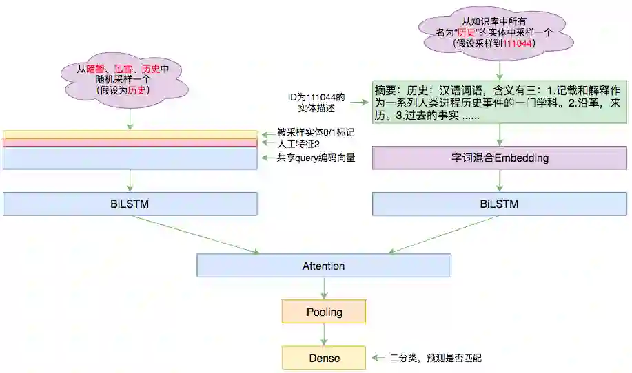 在实体链接的模型中,我们要做的事情是“判断 query 中的某个实体跟知识库中某个同名实体是否匹配”,为此,我们就需要随机采样:从 query 的所有识别出的实体中随机采样一个,然后从知识库里边所有同名实体中采样一个。