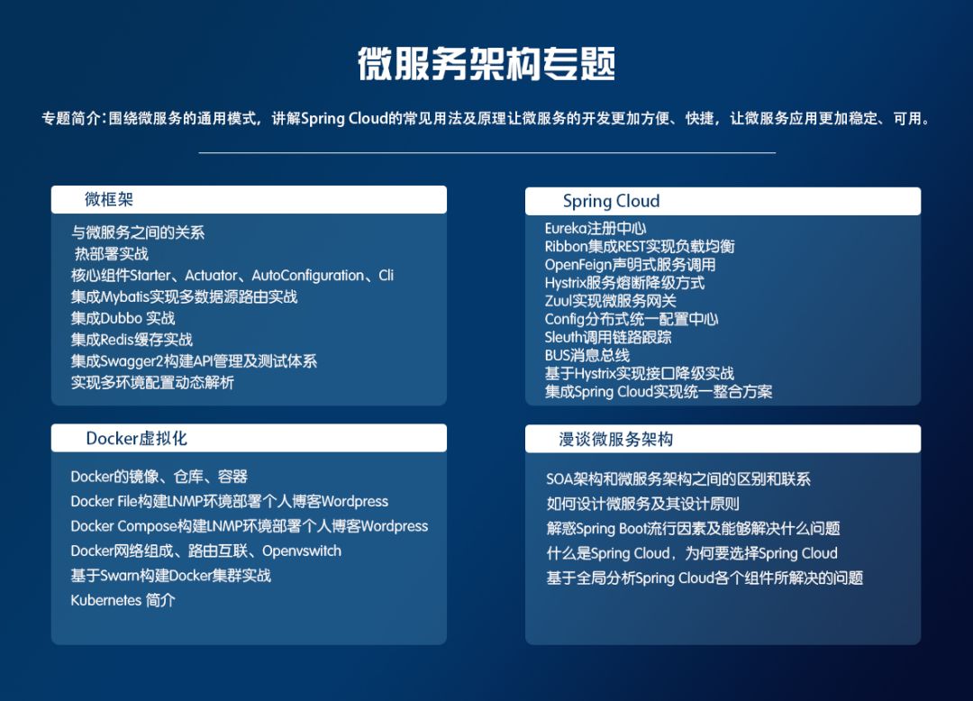 先来看一看这套课程的内容大纲,系统的涵盖了当下主流技术,诚意满满: