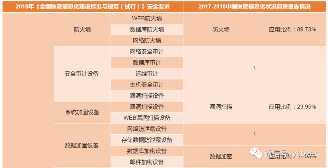 下面这张表,是动脉网结合2018年《全国医院信息化建设标准与规范(试行)》安全要求 ,以及中国医院协会信息管理专业委员会CHIMA发布的《2017-2018中国医院信息化状况调查报告》中的相关数据得出。将两者相互印证之后,动脉网得出了目前三级医院信息安全建设情况:
