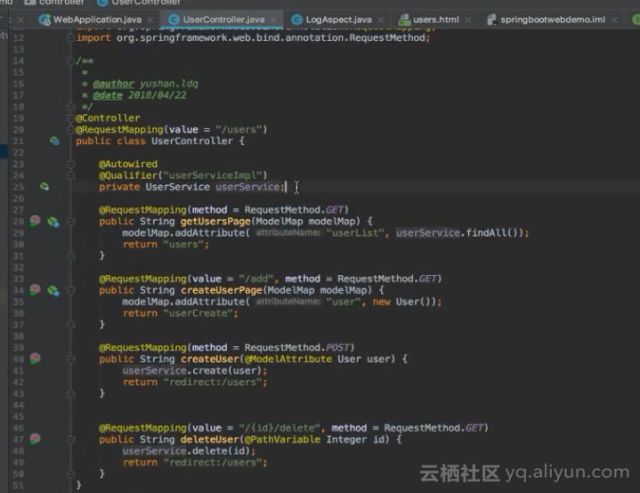 如下图所示的是UserController类,在其上面可以看到@Controller的注解,因为这个注解,UserController的信息将被注入到IOC容器中。在UserController中可以看到UserService的一个成员变量,这个成员变量在整个UserController并没有得到初始化。因为有一个@Autowired注解,这个UserController就可以在初始化之后会产生由于@Autowired注解声明的依赖,这个依赖将由IOC容器负责注入。其所注入的是UserService接口的实现。