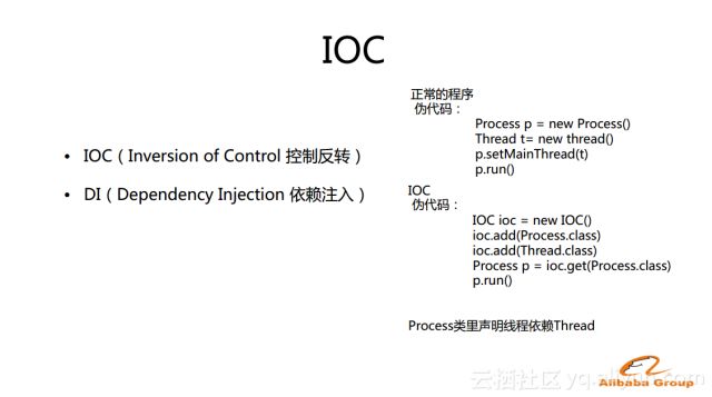上图中还有一段关于IOC的伪代码。首先需要一个IOC容器,通过new去实例化一个,然后告诉容器其所需要控制的类的信息。在Process类里面通过某种配置或者声明的方式告诉IOC容器Process类里面需要依赖于Thread类。当向IOC容器请求一个Process对象的时候,IOC会实例化一个Process,同时也会实例化一个Thread类,根据Process里面声明的依赖将Thread设置到Process里面,并最终给用户一个可以正常运行的Process。