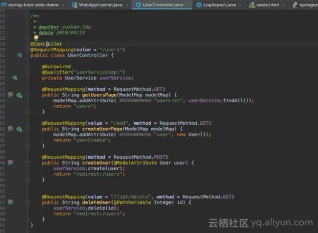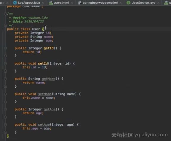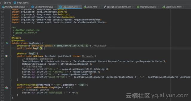 在aop包下的LogAspect类里面可以看到面向切面的编程思想。首先在log()函数之前可以看到一个名为@Pointcut的注解,因为这个注解,这个log()函数将代表一个切点,同时可以看到在@Pointcut注解里面有一个表达式,该表达式标明了切点的位置,其将把demo.controller包下面的所有类以及所有公开的方法都作为切点进行切面编程。在doBefore()方法上面有一个函数注解,该注解就定义了一个切面,该切面位于切点之前,也就是在执行切点之前需要执行这段代码。同时还有一个切面是位于函数执行之后,将打印函数返回值输出的代码。