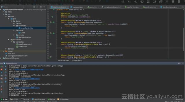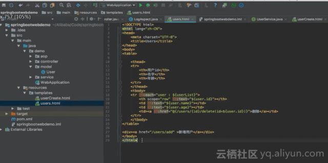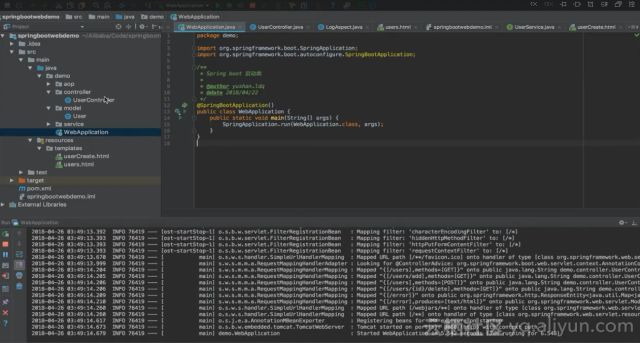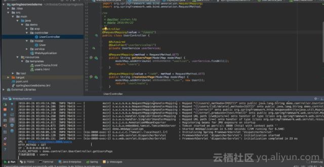 可以通过运行main函数执行整个Spring Boot程序,如下所示Spring Boot便已启动成功。Spring Boot在启动的时候就已经同时启动了一个Tomcat,Tomcat作为Web的容器,将可以对外提供Web服务,其将监听8080端口。根据端口以及UserController定义的地址可以通过浏览器进行访问。通过localhost:8080/users地址发起一个请求,在后台中由于做了切面编程,可以看到后台中UserController中的getUsers这个方法被执行了。而且这个方法的返回值是users。之所以会执行getUsers方法是因为在Controller中配置的@RequestMapping注解,当使用GET请求/users这个地址的时候,请求就会转发到这个方法中,这个方法会操作底层的users数据并返回,通过modelMap将数据和userList这个Key进行绑定并最终返回绑定的字符串users。由于框架的缘故,其会触发模板引擎来解释模板文件。同时由于modelMap的关系,它将给userList赋予后台的用户数据,在最终的模板文件里将会进行转化,使用真实的数据进行替代并渲染出真实的网页出来。